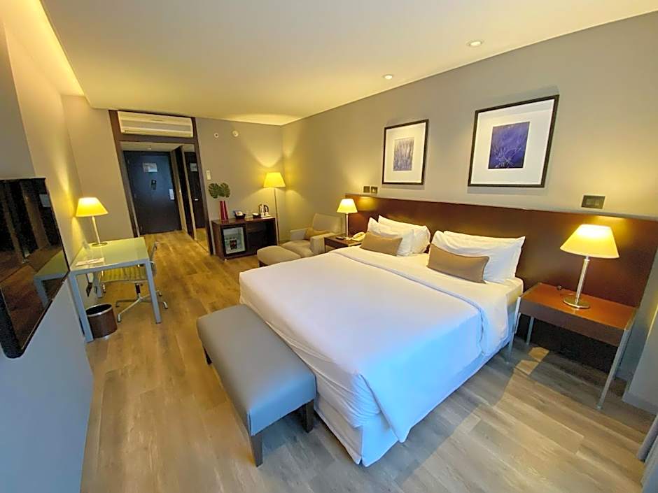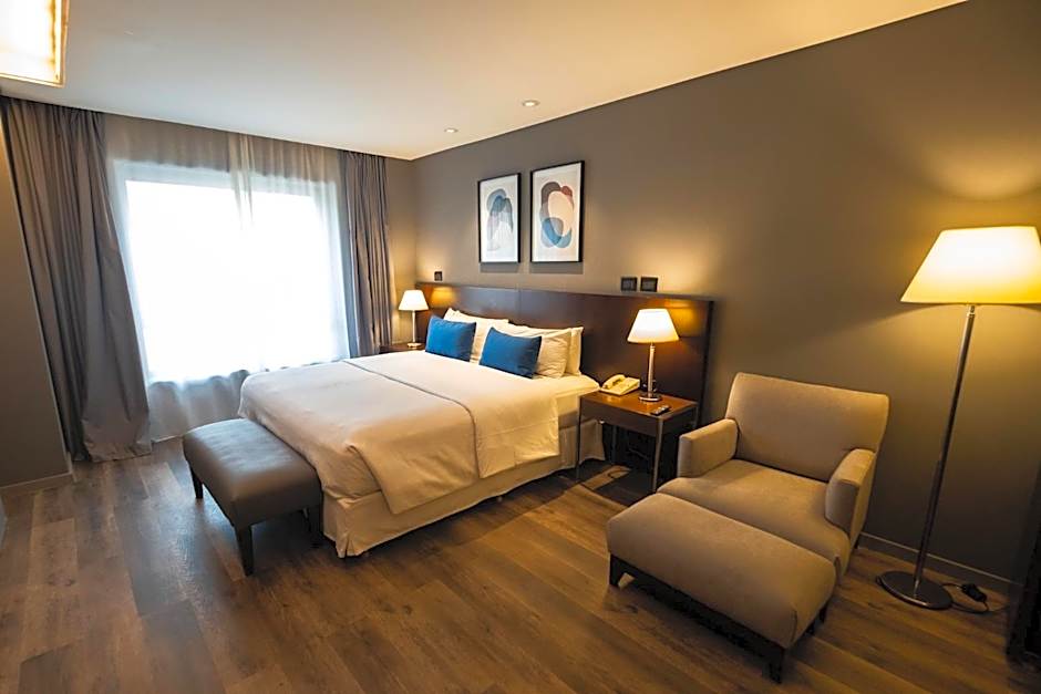 This SUITE room features 60 m2 with a private balcony, a 55" smart TV, a lounge area and bathroom, individually controlled air conditioning and heating, a safety deposit box, and a mini-bar. It includes a complete bathroom with a bathtub, a hairdryer, and a selection of toiletries. High-speed Wi-Fi.